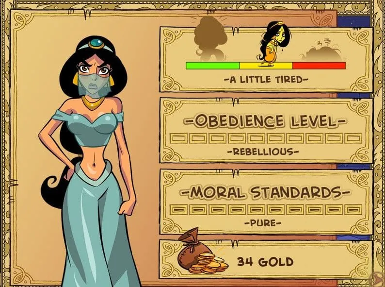 | Character Arc | Affection level, visiting a location at the right time. | Character requirements quests (e.g., “Jasmine must be at the Palace”), medium stat checks. | Affection increase, character-specific scenes, moderate gold. |